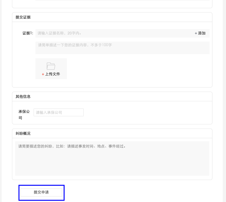 第二步:选择工商联并填写纠纷基本信息并点击“提交申请”按钮