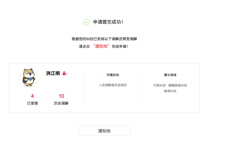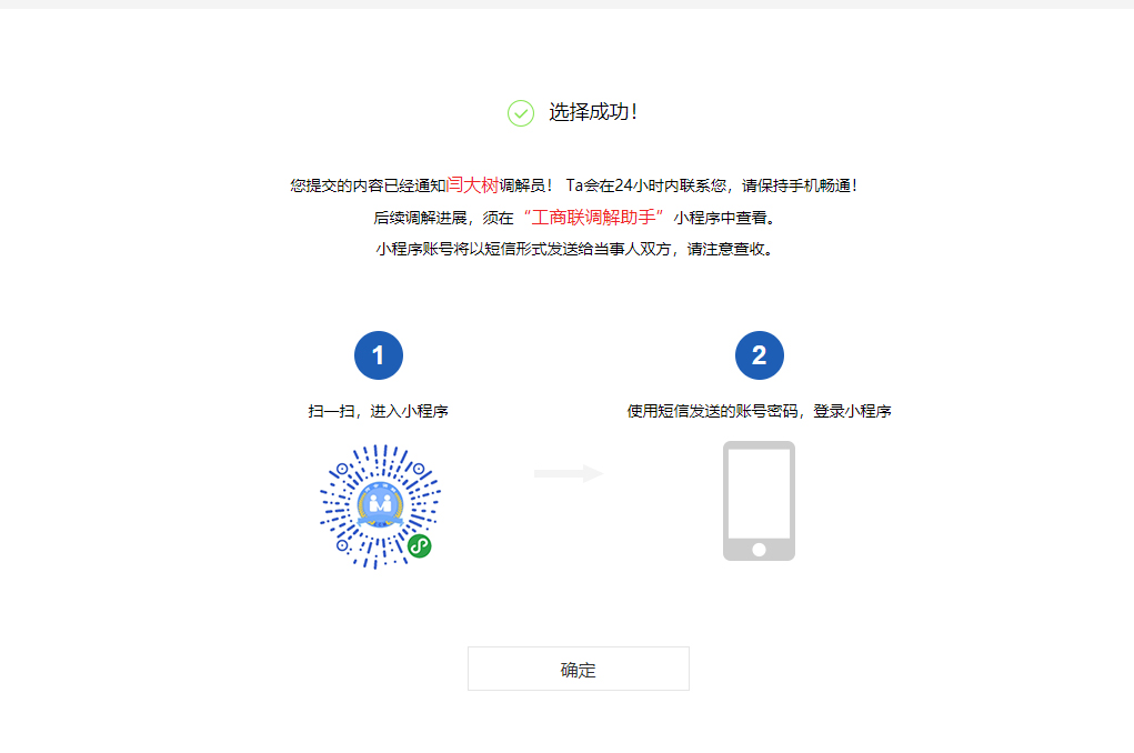 第三步:选择调解员后,点击“通知他”后,并扫码二维码进入【工商联商会调解】小程序跟踪调解进度。