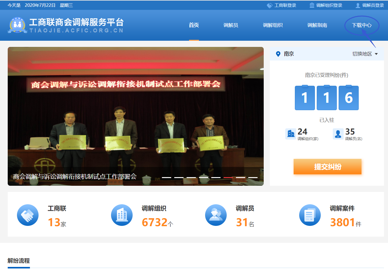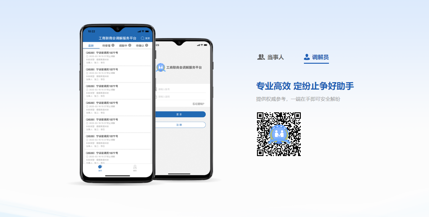 方式:可在首页上方点击“下载中心”,进入软件下载页面,扫描“当事人”二维码,进入【工商联商会调解】小程序。